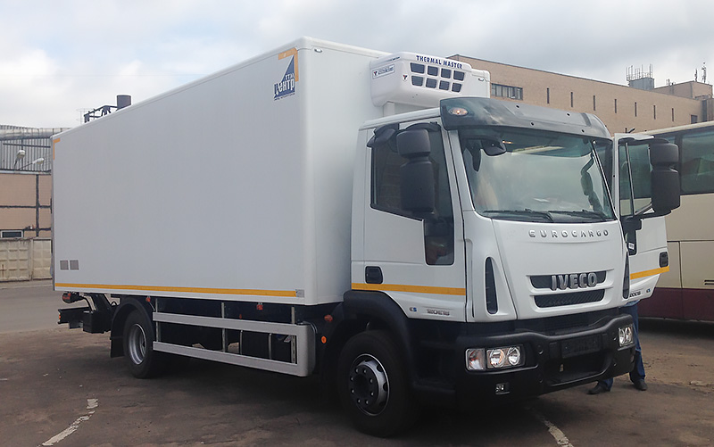 Это европейское шасси Iveco Eurocargo ml120e22 и автофургон известного российского бодибилдера. В нем можно замороженное мясо до -20 градусов. Грузоподъёмность гидролифта 1500 кг помогает осуществлять разгрузку/погрузку в кратчайшие сроки.