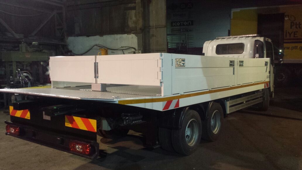А теперь про надстройку. Обычно ставится стальная подъемно-сдвижная платформа с гидравлическим приводом, с лебедкой от 4,1 тонны сил, с пеклеванным или просеченным настилом, с 4-мя башмаками для крепления эвакуированного автомобиля. С гидравлическим маслом все сезонного типа в системе привода. Главное здесь угол заезда он 10-11 градусов, что позволяет без проблем эвакуировать большинство легковых автомобилей. Для бережной погрузки советуем приобретать аппарели. Они позволяют уменьшить до 6-8 градусов. Так же возможно Вам понадобится тент на эвакуатор. Его чаще всего делают на съемном каркасе. Очень распространена опция, при которой на платформу устанавливаются борта, что позволяет получить практически бортовой автомобиль. На фото, изображенных к этой странице, представлена доработанная версия, способная перевозить спецтехнику массой около 5-ти тонн.