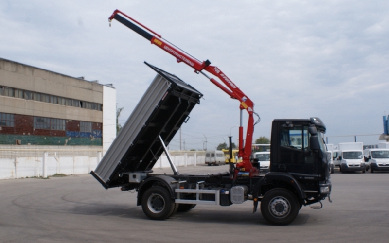 Ивеко Еврокарго MLL150E28W с крано-манипуляторной установкой и самосвальной платформой. Итальянское шасси целиком с итальянским краном Ferrari и бортовой платформой Cantoni. Уникальность , что это полноприводный автомобиль полной массой 12 тонн и возможностью работать как самосвальная платформа, так и как кран манипулятор. Используется в частном секторе, в МЧС. Данный образец строил Сочинскую олимпиаду 2014 года, Самосвал с КМУ не дешевое удовольствие , но вы получаете практически две машины. Именно этот автомобиль мог быть оборудован и грейфером для загрузки сыпучих грузов в борт. Объем кузова всего 5 кубов. Габариты надстройки (длина /ширина/высота)4200x2350x500 мм. Максимальный перемещаемый груз 5,2 т. Гидравлическая стема сотсоит из выдвигаемого на три колена цилиндра, расположенного по центру подрамника. Борта надстройки стальные высотой 500 мм. открывание и запирание бортов механическое . Задний борт с двумя положениями при открывании. При поднятии кузова возможно автоматическое открытие.